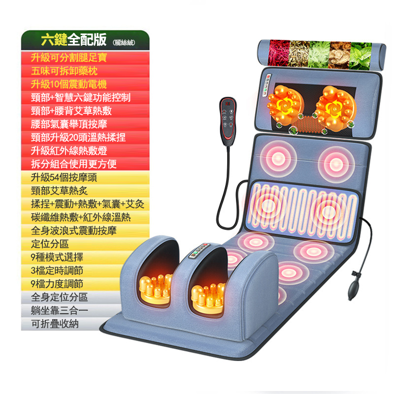 11分鐘前多功能全身按摩床墊 | 電動加熱頸椎、腰部、背部、腿部全方位按摩器,舒緩身心疲勞 - 6鍵旗艦款(6鍵揉捏+震動+氣囊+10電機+腰部熱敷)