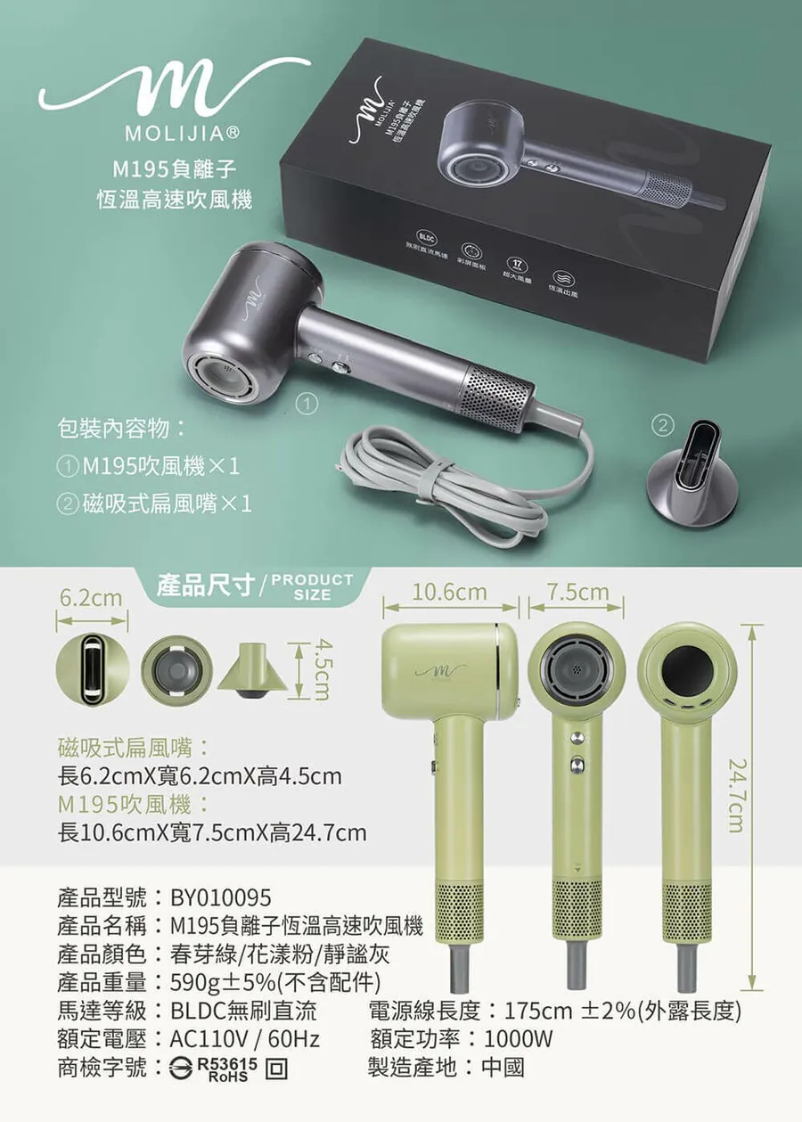 半小時前M195 負離子恆溫高速吹風機 乾髮護髮,一次搞定 - 優惠價二入組NT$1998