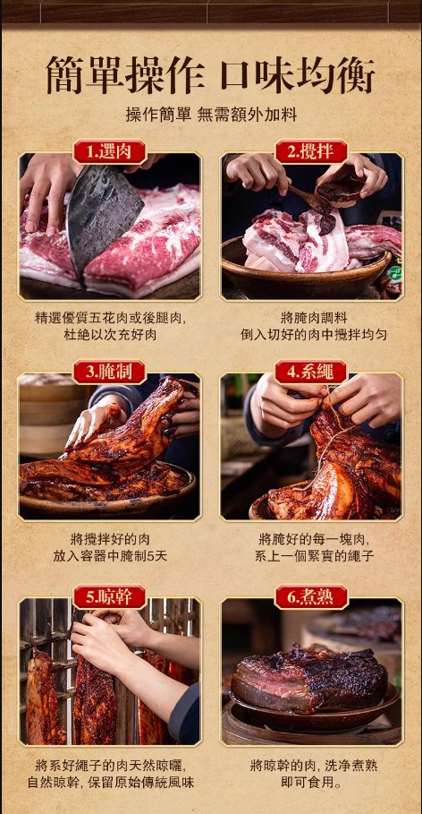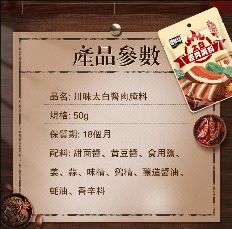 5分鐘前【一袋做6斤】太白醬肉醃料廚師兄川味風乾臘肉料300g/袋醬排骨猪肝 - 98%顧客選擇【太白醬肉醃料 300g/袋】6入組NT$1280
