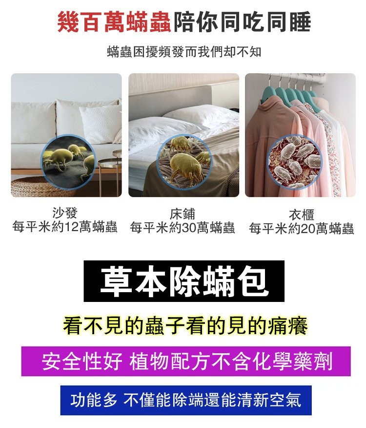 4分鐘前草本除蟎包「春夏季節」蟎蟲細菌容易滋生繁殖快,有了這款除草本除蟎包,在也不用擔心了!! - 「買三送七」十入組NT$1399(均價低至$139/盒)共100小包